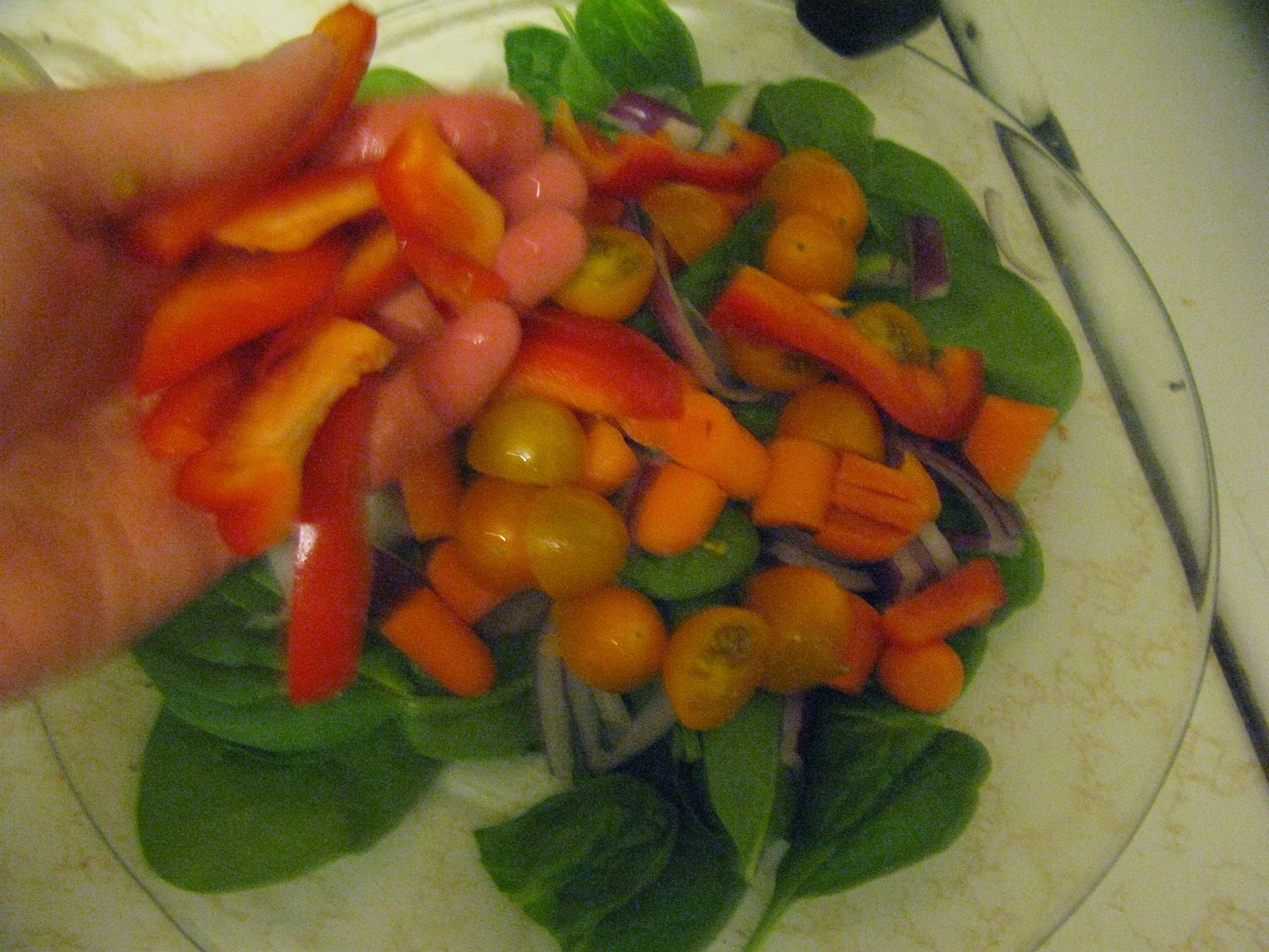 While the cubed sweet potato baked for 20 minutes at 350 degrees, I prepared the rest of the salad. I sprinkled the sweet potato with salt and olive oil before baking. I put down some baby spinach and chopped red onions.