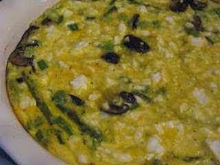 The ingredients are 6 eggs, 1 cup milk, 4 green onions 1/2 cup roasted mushrooms, 1/2 cup roasted asparagus, 8 ounces feta, 1/2 teaspoon salt, and1/8 teaspoon pepper.