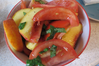 This salad recipe came from the Food Network. I added more tomatoes and peaches than the recipe suggests. I used less basil because I didn't have enough.
