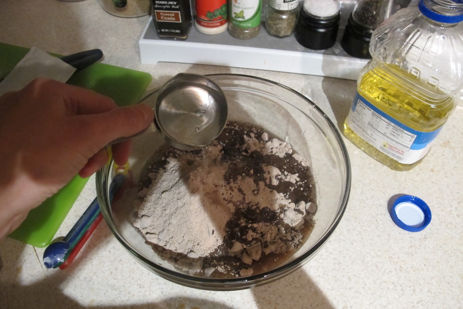 For the chocolate brownies, I added the brownie mix into a bowl. I added the oil, water, and egg. I mixed the batter together.