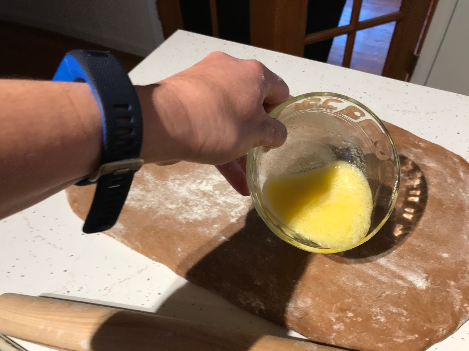 I rolled the dough out into a 15 by 10 inch rectangle. I spread the softened butter evenly over the dough. I then evenly sprinkled on the cinnamon and then the brown sugar.